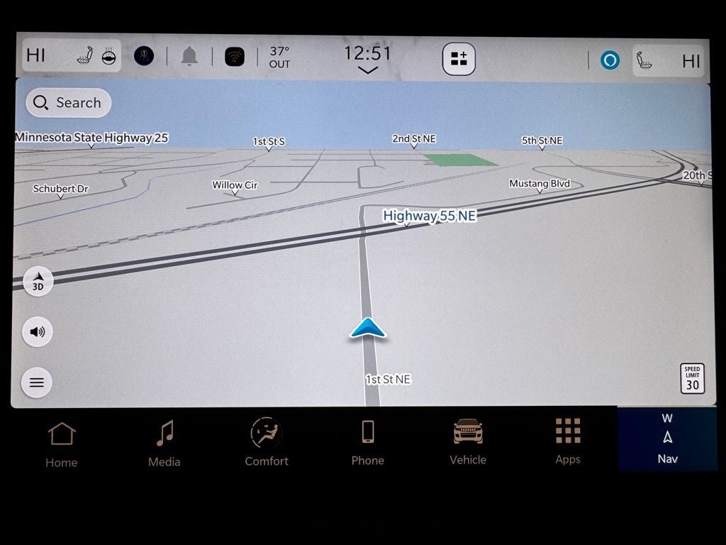 Inside, the cabin offers a premium experience with room for up to seven passengers. Luxurious Capri leather-trimmed seating, heated front and second-row seats, and a heated leather-wrapped steering wheel create a warm, inviting atmosphere for Minnesota winters. The driver enjoys an 8-way power-adjustable seat with memory settings, complemented by tri-zone automatic climate control and soft-touch materials throughout. The Uconnect 5 system with a large high-definition touchscreen provides seamless access to navigation, Apple CarPlay, Android Auto, Bluetooth®, and voice command features, keeping you connected and entertained on every drive.