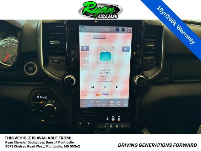 This Big Horns Diamond Black Crystal Pearl-Coat exterior gives it an aggressive, upscale look, complemented by the Night Edition package. The body-color front and rear bumpers, door handles, and fender flares create a sleek, monochromatic appearance, while accent-color premium power mirrors and stylish 20-inch aluminum wheels wrapped in 275/55R20 all-season tires complete its bold design. The trucks muscular stance and black detailing make it equally at home on the jobsite or out for a night in downtown Monticello.