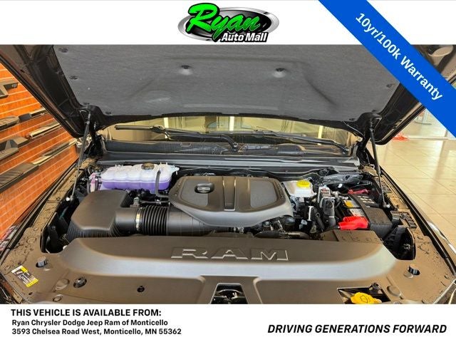 Under the hood, this Ram 1500 features the all-new 3.0L Hurricane Twin-Turbo I6 engine with stop/start technology, delivering exceptional power and torque for towing, hauling, or highway cruising. Paired with an advanced 8-speed automatic transmission, it delivers smooth shifts and responsive performance whether youre towing equipment or navigating Monticellos backroads. The 3.92 rear axle ratio and anti-spin differential rear axle enhance traction and control, while the trailer brake controller provides confident handling when pulling a camper or trailer.