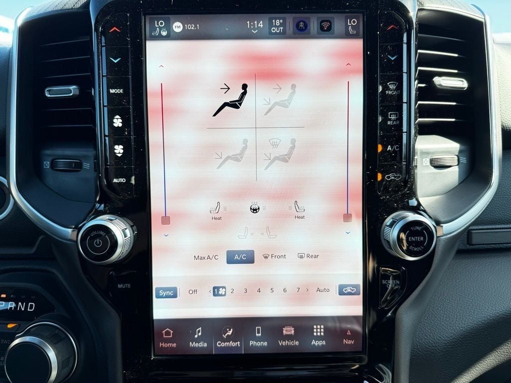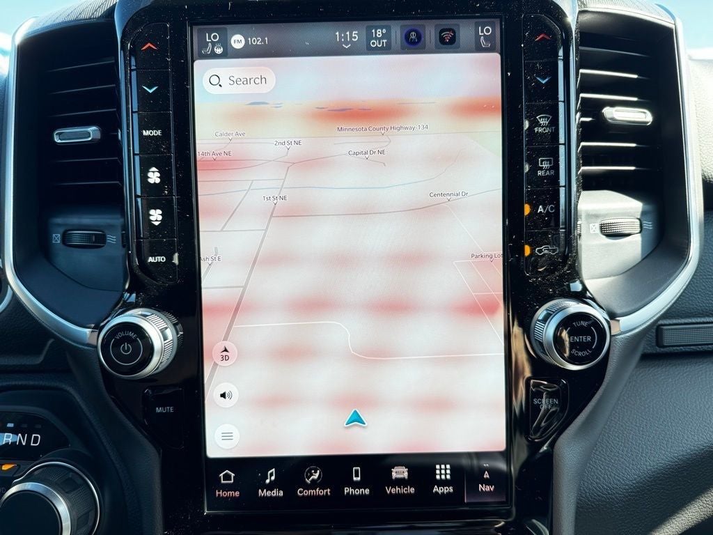 Finished in stunning Granite Crystal Metallic Clear-Coat paint, this Big Horn Crew Cab commands attention with its Night Edition appearance package, which includes body-color front and rear bumpers, accent-color premium power mirrors, and black exterior detailing for a bold, modern look. Stylish 20-inch aluminum painted-clad wheels wrapped in 275/55R20 all-season tires deliver a confident stance and all-weather traction ideal for Minnesotas changing seasons.