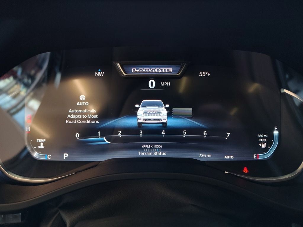 Finished in Diamond Black Crystal Pearl-Coat, this Laramie stands out with the bold Night Edition, featuring 22-inch forged aluminum wheels, a sport performance hood, and body-color front and rear bumpers for a sleek, aggressive look. Accent-color premium mirrors with approach and departure lighting add both style and functionality, creating a strong presence throughout Monticello and surrounding communities.