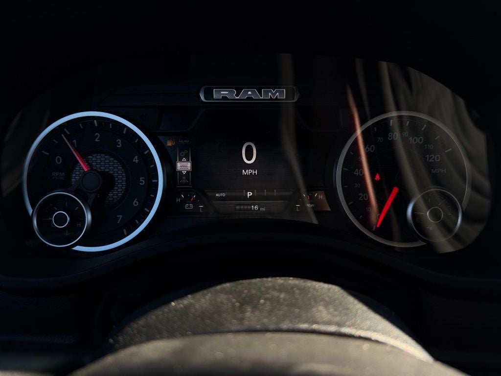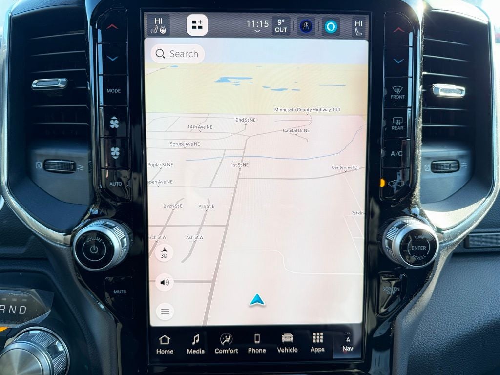 Inside, the Laramie Crew Cab offers a refined, technology-forward cabin designed for comfort and connectivity. Premium leather-trimmed seating, heated and ventilated front seats, a heated leather-wrapped steering wheel, and dual-zone automatic climate control create a welcoming environment in every season. The Uconnect infotainment system with a large touchscreen supports wireless Apple CarPlay and Android Auto, Bluetooth® connectivity, and available navigation, while the digital driver information display keeps key vehicle data easily visible. A premium audio system, power tailgate release, rain-sensing windshield wipers, and thoughtful storage throughout the spacious rear seating area add everyday convenience.