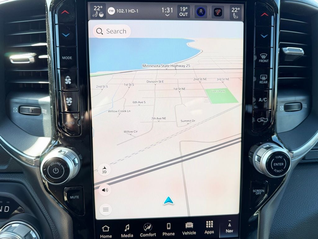 The Laramie trim blends rugged strength with upscale refinement, offering a bold exterior design and a well-appointed interior crafted for comfort and technology. Inside the spacious Crew Cab, premium materials and thoughtful features create a refined driving environment. Standard highlights include an advanced Uconnect infotainment system with a large touchscreen display, smartphone connectivity, multiple USB ports, dual-zone automatic climate control, keyless entry with push-button start, and a premium audio system. The cabin is designed for comfort on every drive with supportive seating, a leather-wrapped steering wheel, and a quiet, smooth ride enhanced by the active noise-control system.