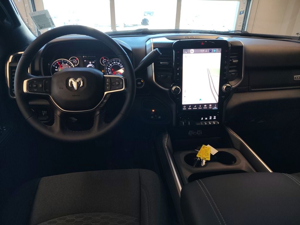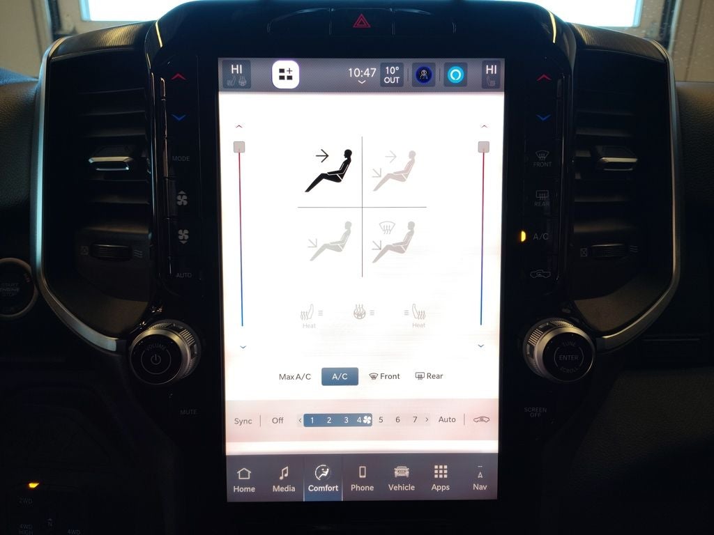 This truck is exceptionally well equipped with the Customer Preferred Package 2UP and the Power Wagon Off-Road Group, featuring a 4.10 axle ratio, Ram Articulink suspension, LT285/70R17 all-terrain tires on black painted aluminum wheels, Mopar rock rails with step pads, LED bed lighting, and a spray-in bedliner by Mopar. Inside, the Power Wagon Level 1 Equipment Group adds leather-trimmed bucket seats, ventilated and heated front seats, heated second-row seating, dual wireless charging pads, power adjustable pedals with memory, rain-sensitive windshield wipers, memory settings for the driver seat, mirrors, radio, and pedals, and power heat, fold, and telescoping exterior mirrors with auto-dimming and reverse tilt functionality.