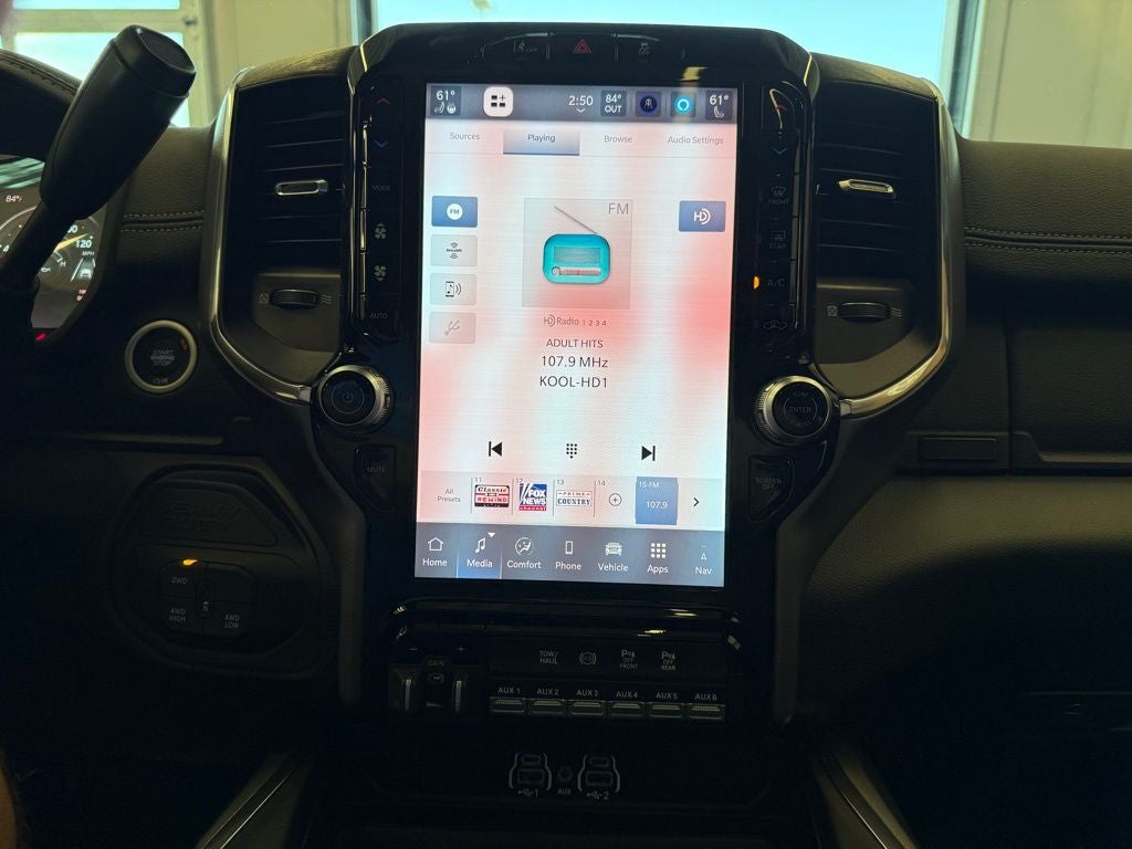 Inside, the cabin combines rugged functionality with refined luxury. Leather-trimmed bucket seats, a power sunroof, and second-row in-floor storage bins bring comfort and versatility, while the Laramie Level 1 Plus Equipment Group adds advanced features including dual wireless charging pads, adaptive steering, power-adjustable pedals with memory, power-folding and auto-dimming mirrors, and safety technologies like traffic sign recognition, drowsy driver detection, and active lane-management. Rain-sensing windshield wipers further add to the convenience of this premium heavy-duty truck.