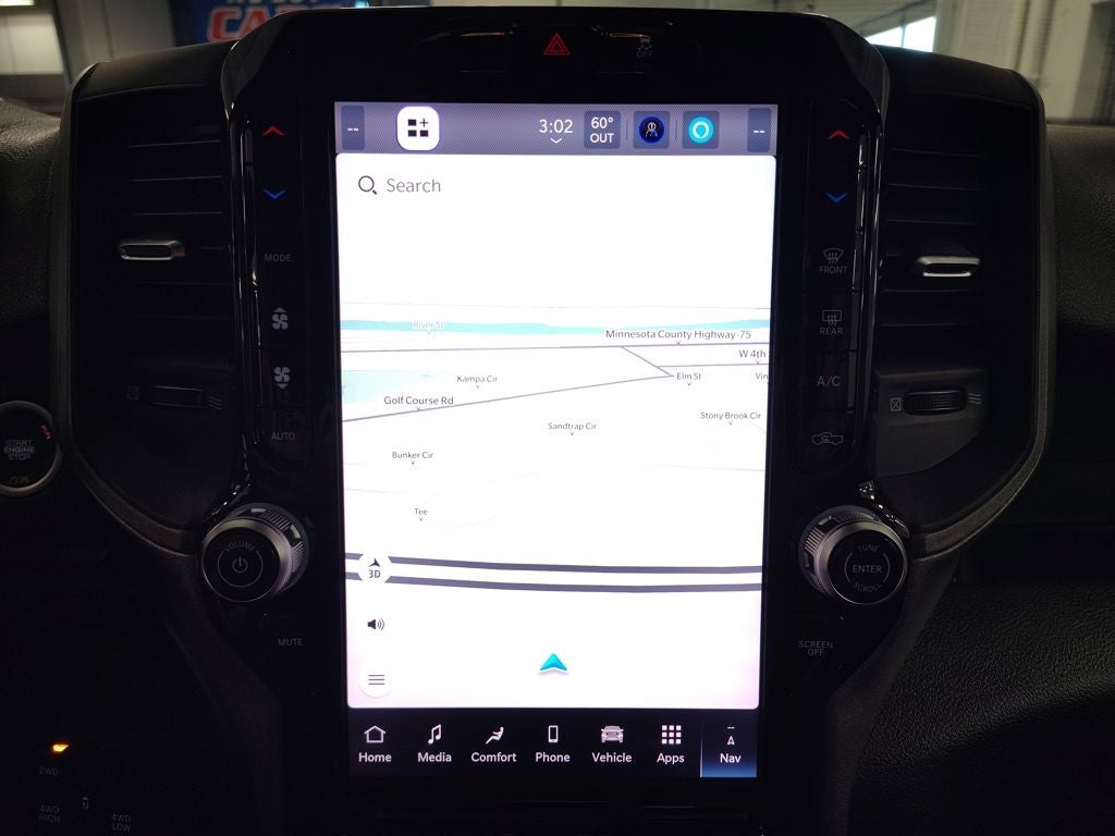 Inside, the Tradesman cabin combines practicality with modern technology. Standard equipment includes durable seating, easy-to-use controls, and advanced connectivity through the Uconnect 5 system with a 12-inch touchscreen display and integrated navigation. This truck is upgraded with the Tradesman Level 2 Equipment Group, adding features such as a digital rearview mirror, trailer light check system, trailer tow pages, dual-zone automatic climate control, remote start, and a rear power-sliding window for added convenience.