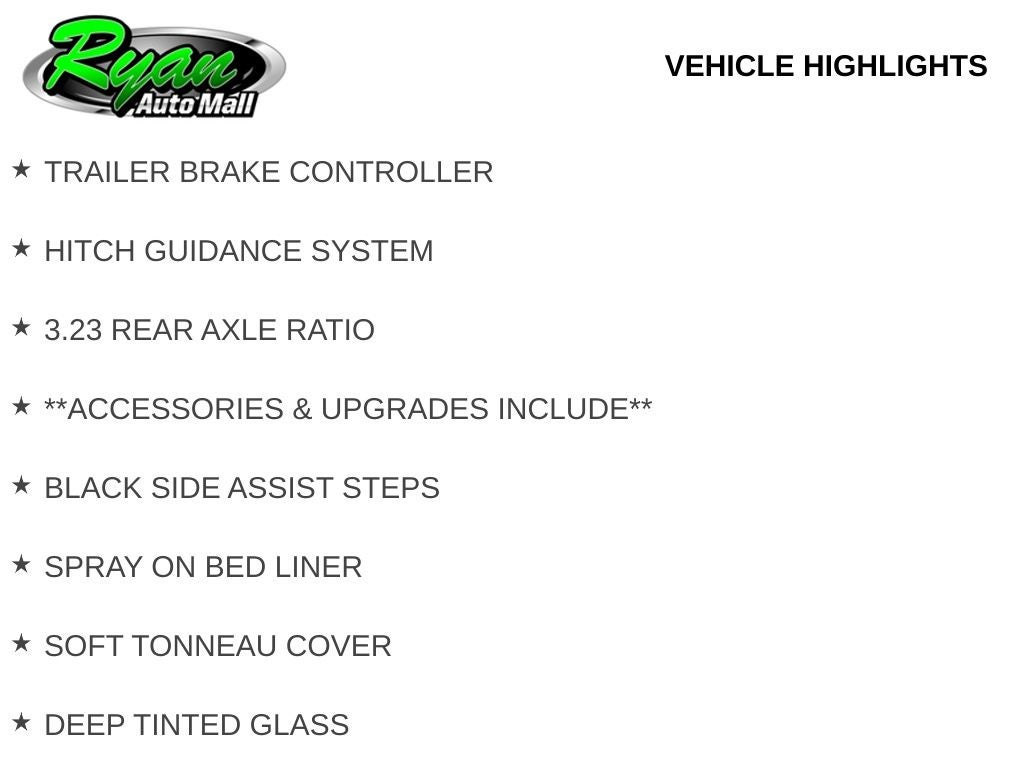 Equipped with the All Star Edition and Z71 Off-Road Suspension packages, this Silverado is built for both work and adventure. Performance and handling features include an auto-locking rear differential, skid plate package, hill descent control, and a 3.23 rear axle ratio. Towing and hauling are well supported with a 5-foot-8-inch cargo bed, LED cargo bed lighting, trailering equipment, trailer brake controller, and hitch guidance system. Exterior upgrades such as black side assist steps, a spray-on bed liner, soft tonneau cover, deep tinted glass, splash guards, tow hooks, and 20-inch painted aluminum wheels complete the truck’s capable and aggressive look.