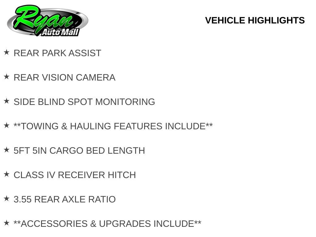 For towing and hauling needs, this truck offers a 5-foot 5-inch cargo bed, Class IV receiver hitch, 3.55 rear axle ratio, tow hooks, and a spray-on bed liner to protect the bed surface. A soft tonneau cover is included for added cargo security, while black side assist steps make entry and exit easy. This truck rides on durable 17-inch silver painted aluminum wheels that complete its confident exterior look.