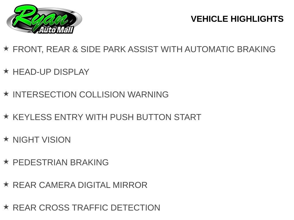 Driver-assist technologies include adaptive cruise control, active lane management, forward collision alert with pedestrian braking, side blind spot monitoring, rear cross traffic detection, surround vision, intersection collision warning, traffic sign recognition, front and rear park assist with automatic braking, night vision, and a rear vision camera with washer.