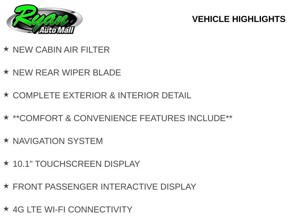 Technology is highlighted by the 10.1-inch touchscreen display with integrated navigation along with Apple CarPlay and Android Auto connectivity, wireless device charging, and available 4G LTE Wi-Fi capability. A front passenger interactive display and head-up display add to the modern driving experience.