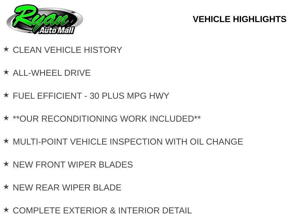 Our reconditioning work included a comprehensive multi-point vehicle inspection with fresh oil change, new front wiper blades, a new rear wiper blade, and a complete exterior and interior detail. This careful preparation ensures the vehicle is clean, well maintained, and ready for its next owner.