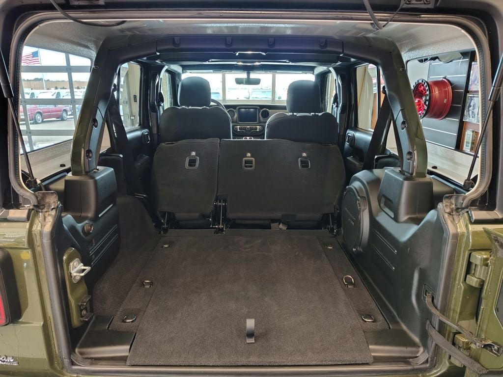 This well-equipped Willys includes desirable comfort and convenience features such as an 8.4-inch touchscreen display with integrated navigation, premium Alpine sound system, 4G LTE Wi-Fi connectivity, Apple CarPlay and Android Auto, heated front seats, heated steering wheel, automatic climate control, bucket seats, universal garage door controller, remote start, rear window defroster, and the Freedom Black three-piece hard top for year-round versatility.