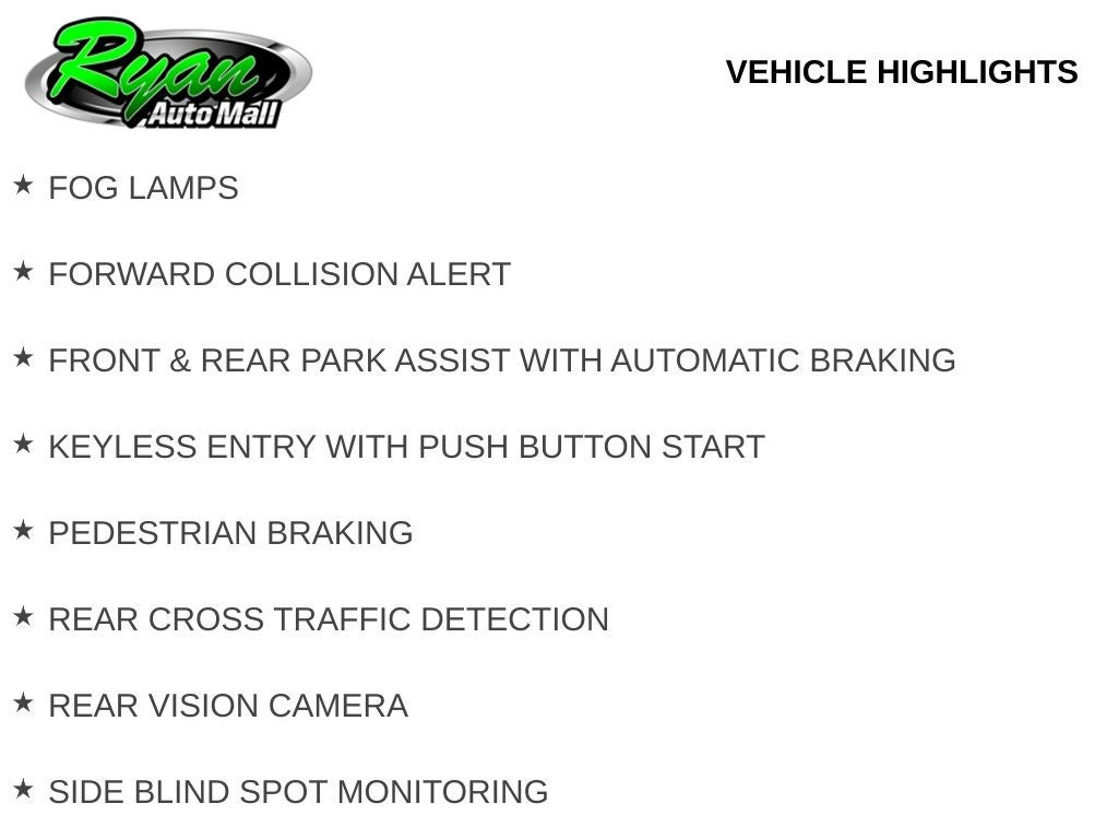 Advanced safety features include adaptive cruise control, active lane management, forward collision warning with pedestrian braking, blind spot monitoring, rear cross traffic detection, and front and rear park assist with automatic braking. A rear vision camera, fog lamps, and keyless entry with push-button start provide added confidence.