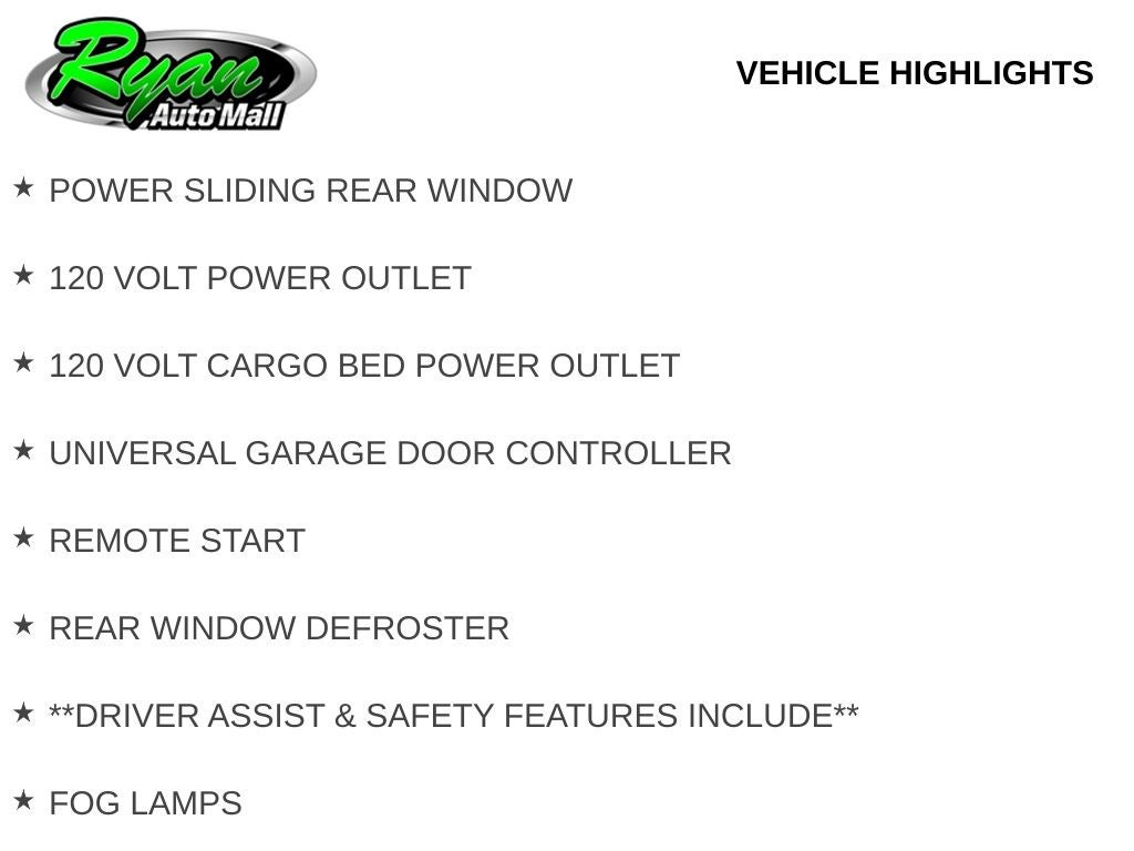 This truck is also equipped for serious towing and utility, featuring a 6-foot 4-inch cargo bed, trailer brake controller, 3.73 rear axle ratio, and power folding and telescoping trailer tow mirrors. Additional functional upgrades include a 120-volt interior outlet, a 120-volt bed outlet, remote start, a power sliding rear window, tow hooks, and deep tinted glass, making it as practical as it is capable.