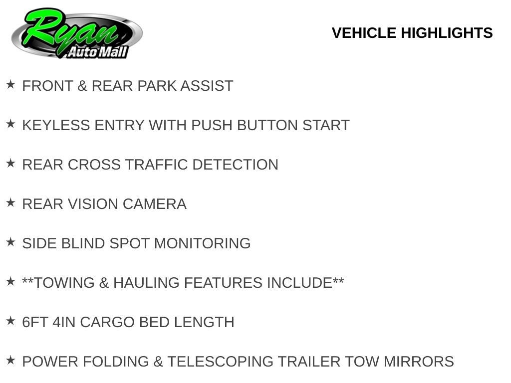 Safety and driver assistance features include front and rear park assist, blind spot monitoring, rear cross path detection, fog lamps, keyless entry with push-button start, and a rear vision camera to provide added confidence on the road or job site.